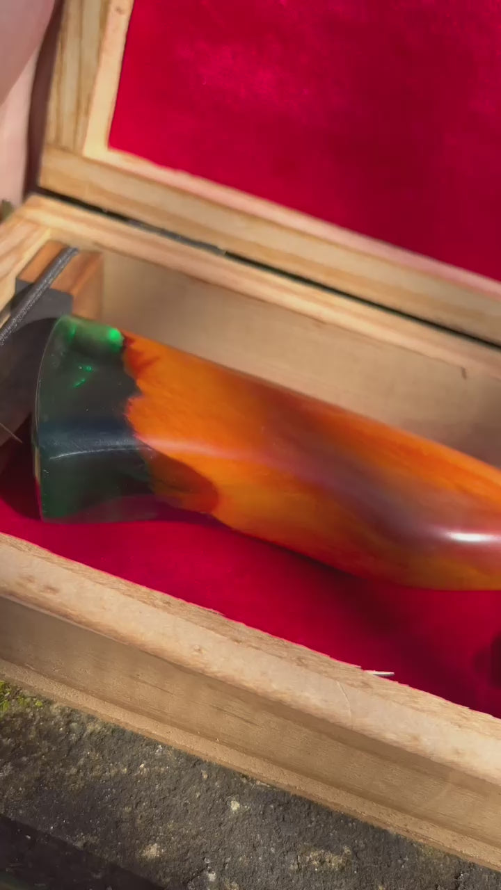 - Corte Preciso e Personalizado: A faca do kit, com lâmina de 10 polegadas própria para churrasco, oferece um corte limpo e eficiente. O cabo, assim como nas outras peças, vem em cristal líquido e madeira, com a opção de escolher a cor que mais combina com seu estilo.