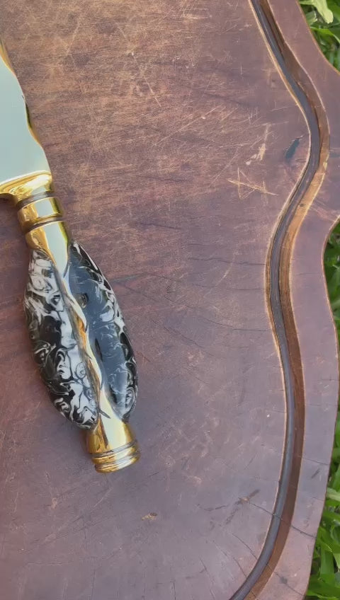 A lâmina da faca é feita de aço inox de alta qualidade, proporcionando um corte preciso e suave. O cabo ergonômica em cristal liquido oferece conforto e segurança durante o manuseio. O acabamento em ouro 24k dá à faca um toque de luxo, sofisticação e elegância, tornando-a unica e uma verdadeira obra de arte.