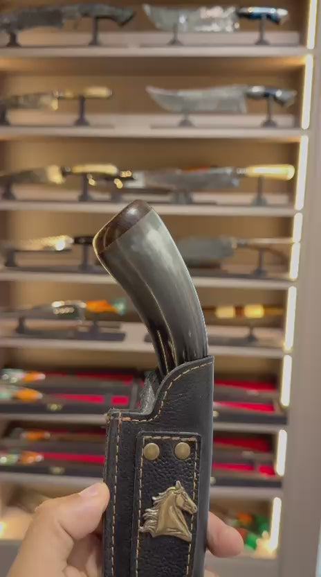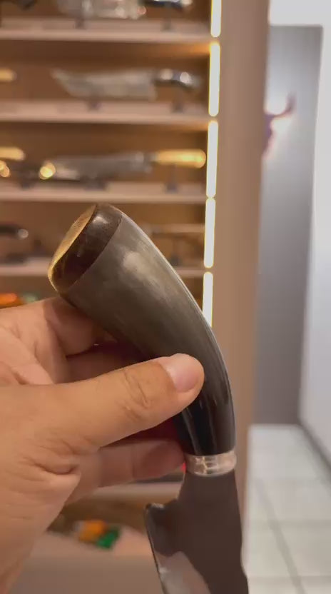 Cabo artesanal composto por chifre bovino, madeira nobre, proporcionando pegada firme e visual sofisticado